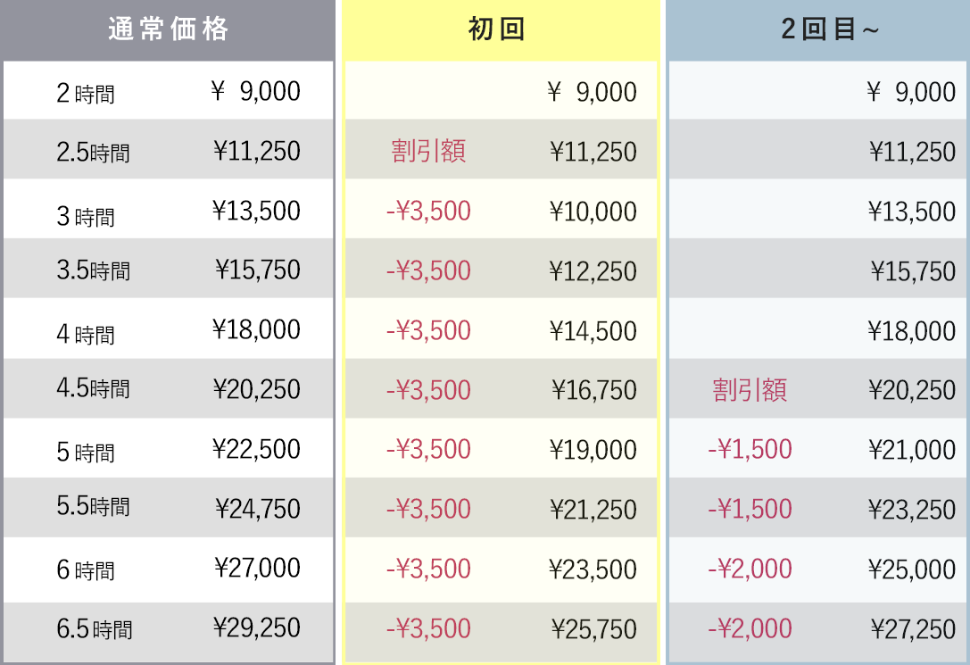 ※ご予約は初回は3時間以上、以降2時間以上からお受けしております。